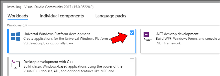 Select the "Universal Windows Platform development" from the Workloads item and then proceed with the installation.