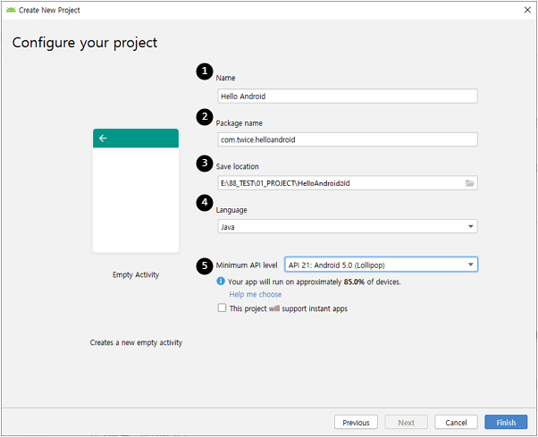 5 | Minimum API | 最小仕様SDKを設定します。SDKの項目を変更すると、下部で該当バージョンAPIレベルのデバイスの互換性に関する情報を確認できます。 |