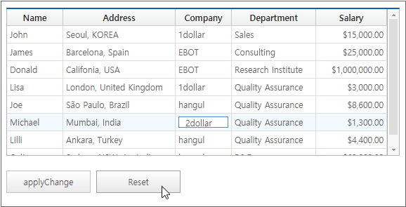 The following is an example of binding Dataset with Name, Address, Company, Department, Salary information to the Grid component.