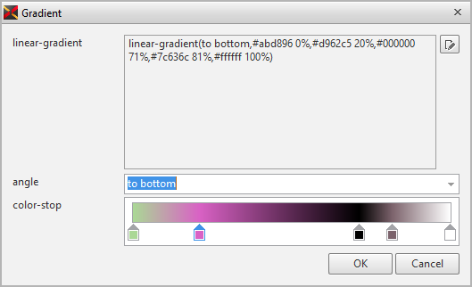 colorプロパティ値を指定する際linear-gradientプロパティを編集する場合に使用します。[angle]項目でグラデーションを適用する方向を指定して、[color-stop]項目でグラデーションの色を指定することができます。グラデーションの色を指定する場合は、[Color Picker]を使用します。