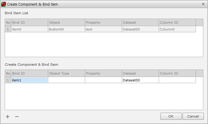 Bind Item Editorと同じように、コンポーネントにDatasetをバインドする場合に使用します。相違点は、Bind Item Editorの場合、あらかじめ生成されたコンポーネントにバインドしますが、Create Component&Bind Item Editorは、コンポーネントの生成と同時にバインドできるようにする機能を提供します。