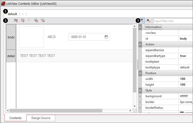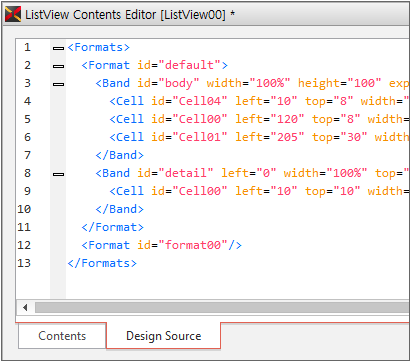 ListView Contents Editorは基本編集ウィンドウ、バンド編集ウィンドウ、プロパティウィンドウ、およびDesign Sourceで構成されています。基本編集ウィンドウでは、コンテキストメニューとショートカットを使用してBody、Detailバンドを追加/削除するか、プロパティを編集することができます。基本編集ウィンドウの左側にはBody、Detailで区分されて表示されます。プロパティウィンドウには、バンドやセルのプロパティ値が表示されます。