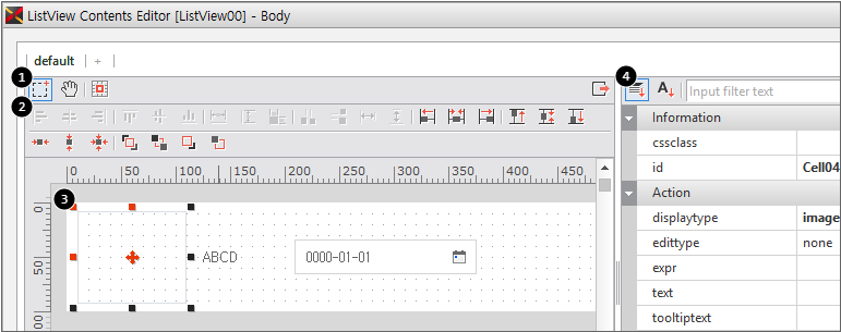 1 | ツールバー(セル) | セルを選択するか、編集領域の位置を変更することができ、新しいセルを追加することができます。 Select:1つ以上のセルを選択することができます。 Move:画面が描画されるキャンバス領域の位置を移動します。 Cell:新しいセルを追加します。 Exit Editor:基本編集モードに切り替えます。 |