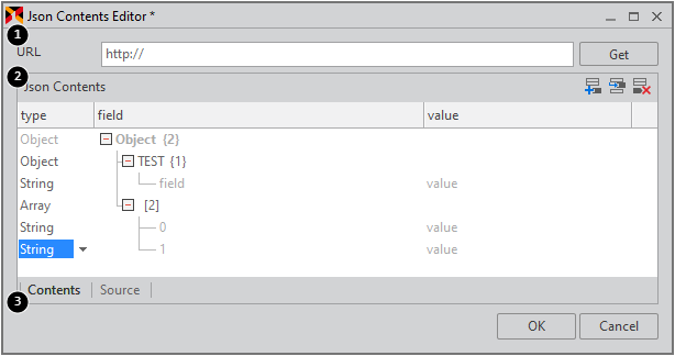 3 | 表示モード | Contentsタブを選択した場合、ツリービュー形式でデータを表示します。 Sourceタブを選択した場合、コード形式でデータを表示します。 |