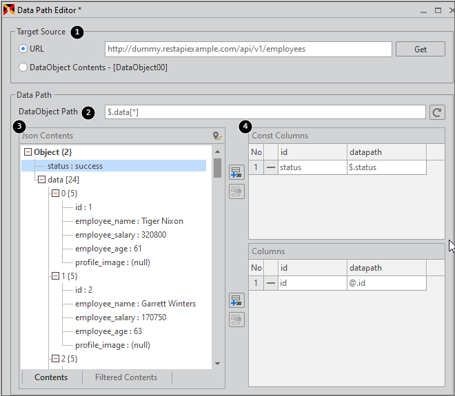 2 | DataObject Path | Dataobject Root Pathを設定します。 Json Contents 結果から項目を選択して指定できます。 Path 設定後、「Refresh」ボタンをクリックすると、「Filtered Contents」タブにフィルターした結果値を表示します。 |