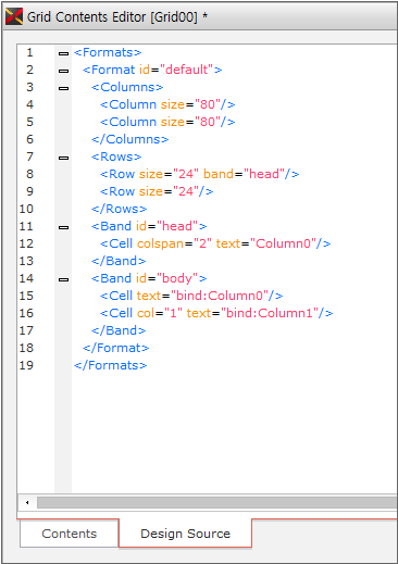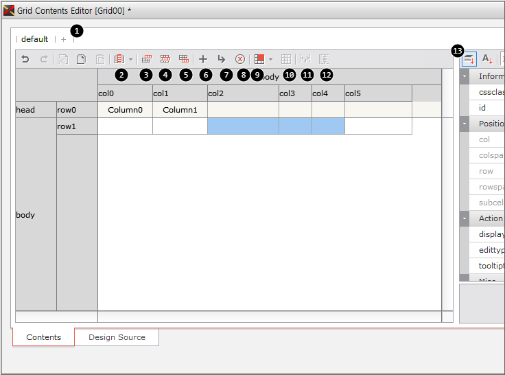 Grid Contents Editorは、基本編集ウィンドウ、プロパティウィンドウ、デザインソースで構成されています。基本編集ウィンドウでは、ポップアップメニューやシュートカットキーとを使ってセルを追加/削除したり、プロパティを編集することができます。基本編集ウィンドウの最上段にはカラムインデックスが表示され、下にはHead、Body、Summaryに区分されて表示されます。プロパティウィンドウには、セル区分、該当セルのプロパティリスト、それぞれのプロパティ値が表示されます。
