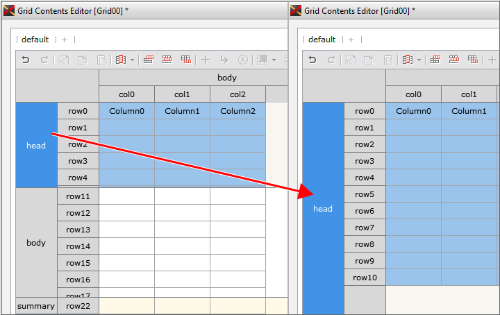 headまたはBody領域のRowが多い場合、エディタの左側にあるタイトル領域をダブルクリックすると、該当領域のみ表示されたり、領域全体が表示されるように選択することができます。