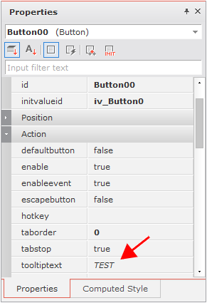 InitValueを適用するコンポーネントを選択し、[プロパティ]ウィンドウでinitvalueidプロパティ値を指定します。プロパティ値が適用されると、該当するプロパティ値にInitValueが適用されます。適用された値は、イタリック体で表記します。