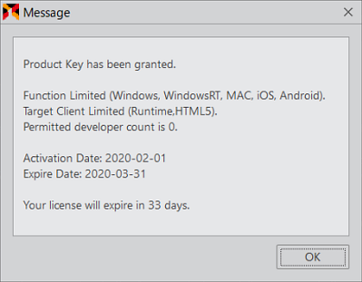 正常な値を入力した場合、次のようなメッセージが表示され、ライセンス認証が完了します。