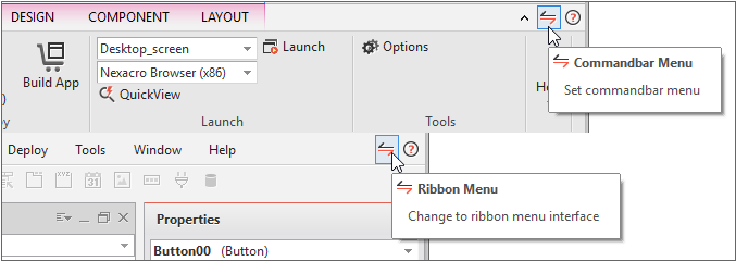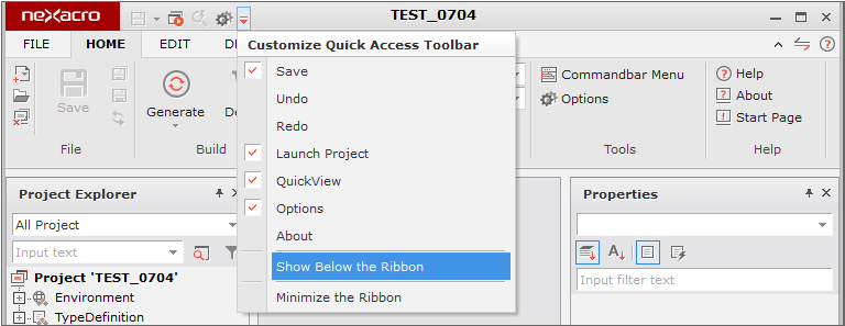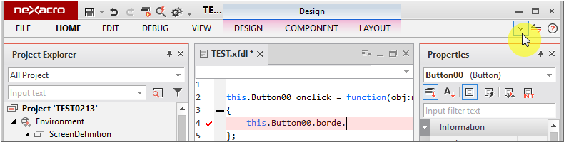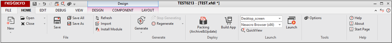 nexacro studioのインストール時のデフォルト設定として提供されるメニューです。関連するコマンドがリボンタブに囲まれています。上部のメニューバーから項目を選択すると、下部に必要な機能ボタンが画面に表示されます。