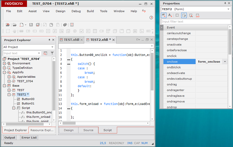 Script編集ウィンドウでは、Form及び各種コンポーネントのEvent処理関数とユーザー関数をJavaScriptで作成します。