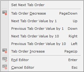 Tab Order Editモードでは、コンテキストメニューを以下のようにサポートします。