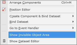 Invisible Layoutウィンドウが表示されない場合は、Design Window[Popup Menu]で‘Show Invisible Object Area’ メニューを利用してInvisible Layoutウィンドウを表示することができます。