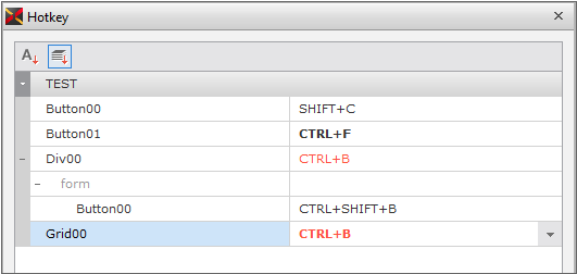 画面に設定されたコンポーネントのHotkeyプロパティを指定する機能です。メニューの[Design>Hotkey Editor]を選択し、該当機能を使用することができます。既に設定されたHotkeyプロパティ値が表示され、設定された値がない場合は空欄で表示されます。Hotkey値を変更すると、太字で表示され、同じHotkey値が設定された場合、赤で表示されます。