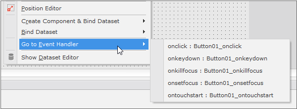 選択したコンポーネントに設定したイベントがある場合には、該当スクリプトコードの位置に移動する機能を提供します。コンポーネントを選択し、コンテキストメニューから[Go to Event Handler]項目を選択して、目的のイベント関数を選択します。