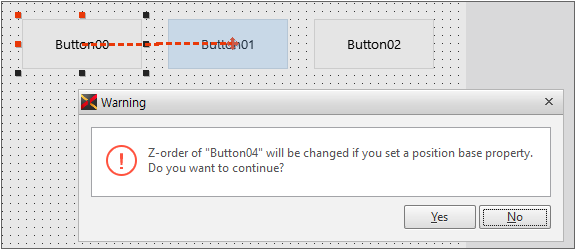 制約事項によりpositionstepプロパティ値が-1であるか、選択したコンポーネントと親が異なるか、positionstepプロパティ値が異なる場合には、プロパティウィンドウに表示されません。また、z-orderが自分より高いコンポーネントもプロパティウィンドウには表示されません。