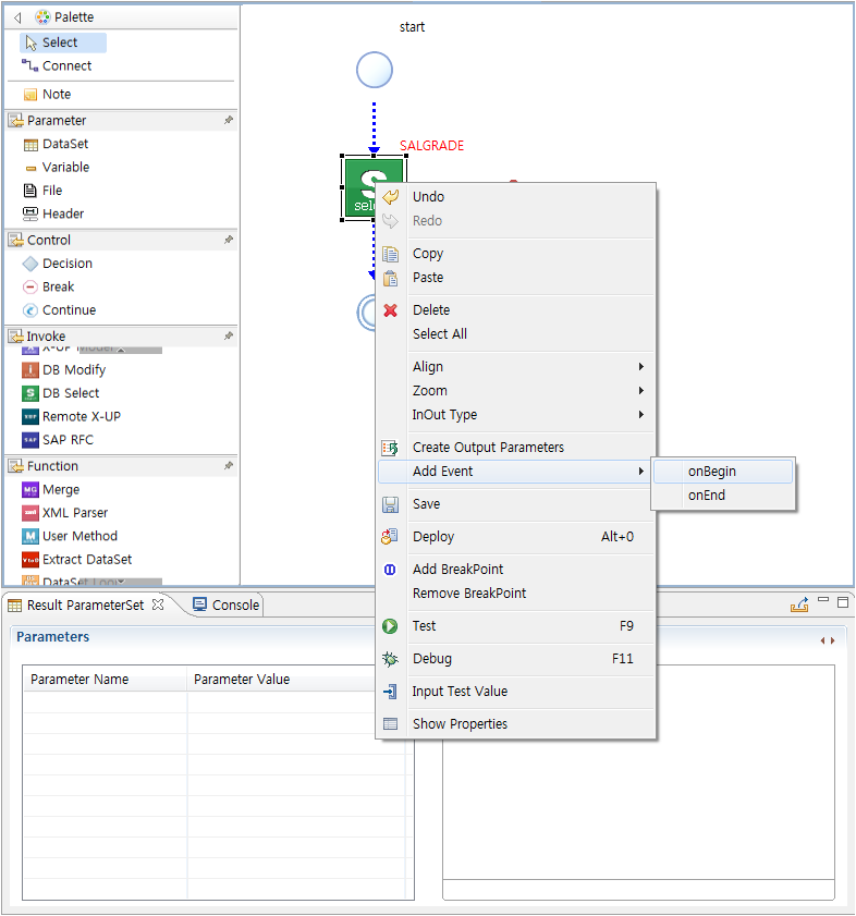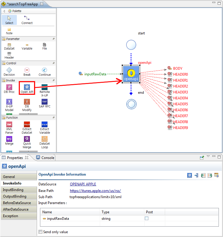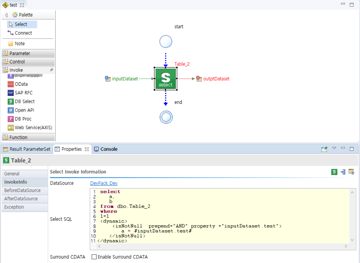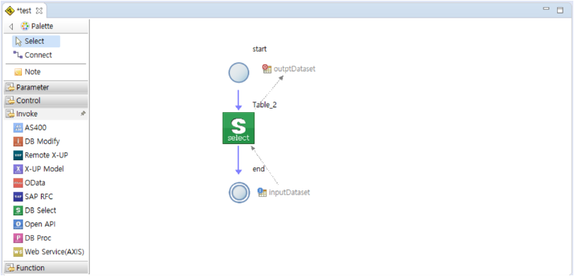 고정된 in-out 파라미터 이름과 상관없이 사용자가 원하는 파라미터 이름을 정의할 수 있습니다. Invoke와 함께 생성된 커넥션은 삭제할 수 없으며 만약 다른 파라미터와 연결하고자 한다면 reconnection을 통하여 변경할 수 있습니다. 때문에 reconnection할 때 붉은 번개 표시가 생기면 Input Binding/Output Binding을 체크 해야합니다.