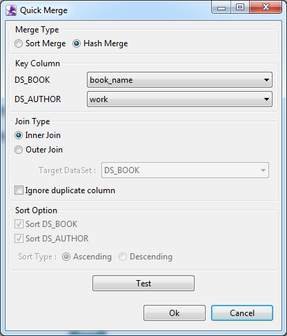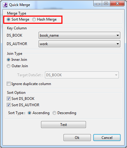 SortMerge : 두 개의 데이터셋을 입력된 KeyColumn을 기준으로 정렬한 후 융합을 수행합니다. 정렬하기 위해 JoinType(Inner Join or Outer Join)을 제공하며 있으며, 중복되는 컬럼을 융합에서 제외할 수 있습니다. 또한 입력되는 두 개의 데이터셋이 이미 정렬이 되어 있을 경우 Sort Option을 해제할 수 있습니다.