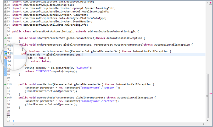 Automation Model은 모델 디버깅을 위해 에디터상에서 노드에 직접 BreakPoint를 추가할 수 있습니다. BreakPoint가 노드에 추가되면 에디터가 소스 생성 시 자동으로 해당 라인에 BreakPoint를 등록합니다.