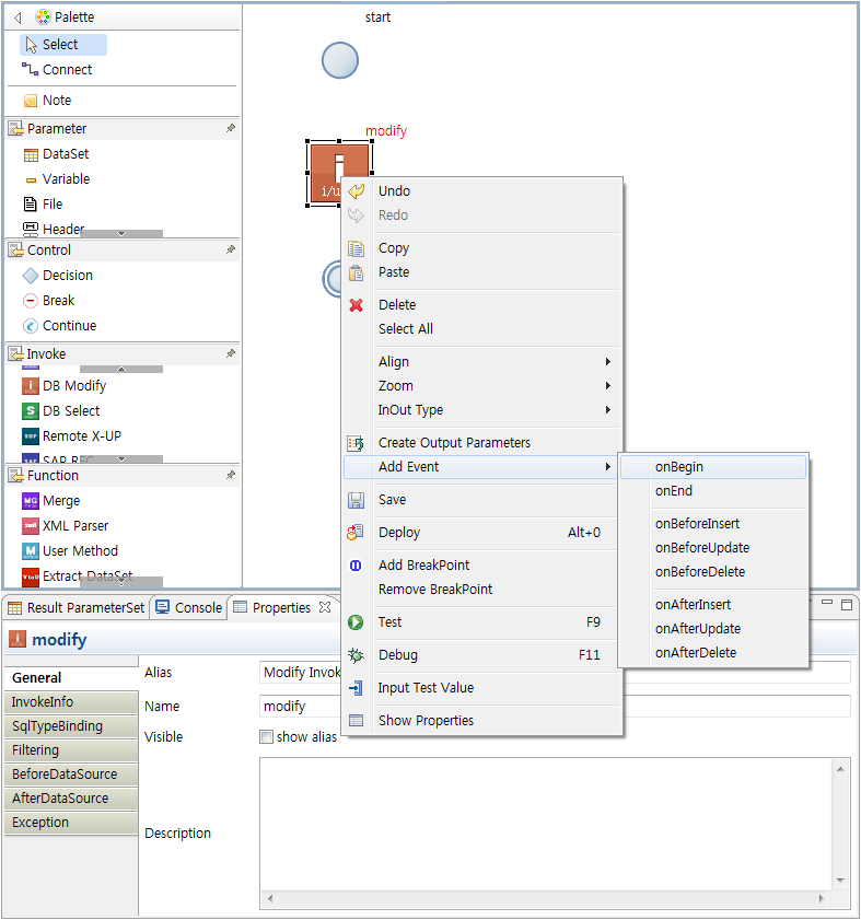 해당 Invoke가 사용하는 데이터소스를 통해 Legacy와 연결을 맺기 직전에 사용자가 원하는 로직을 자바 코드로 추가할 수 있습니다.