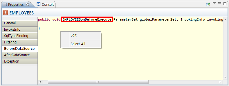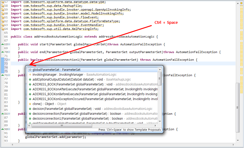 프로퍼티내에 존재하는 모든 자바 코드 편집창은 공통적으로 자바 에디터에서 제공했던 동일한 어시스트 팝업 및 자바 문법 오류 검사 기능을 가지고 있습니다.