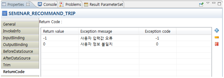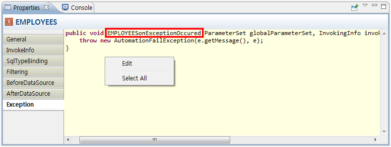 Exception 탭은 해당 Invoke의 예외처리를 수행하는 단계로 사용자가 원하는 로직을 자바코드로 추가할 수 있습니다