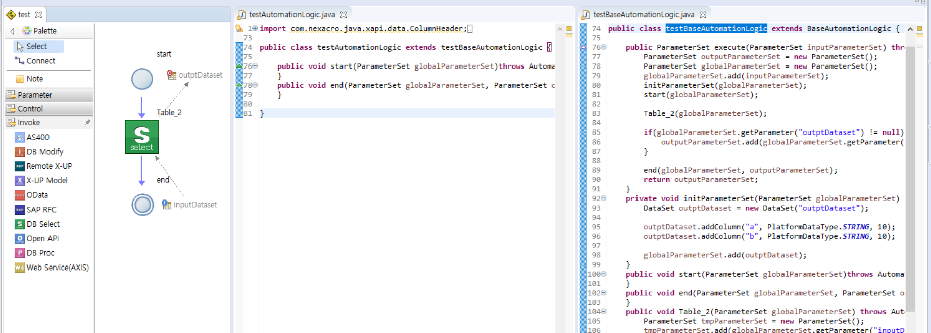 xam파일에 flow-chart 그리는 방법으로 비지니스로직을 개발 할 수 있습니다. 개발한 내용은 BaseAutomationLogic.java 에 자동 생성됩니다.