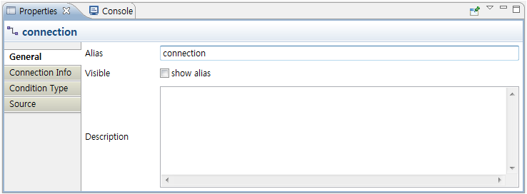조건 커넥션의 General에는 Alias, Visible, Description 세 가지 정보를 정의할 수 있습니다.