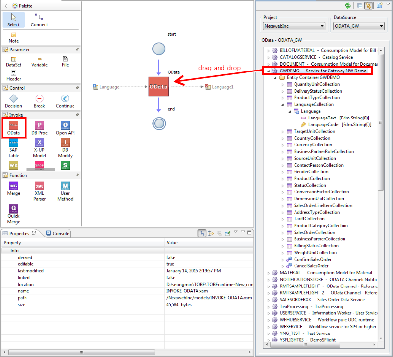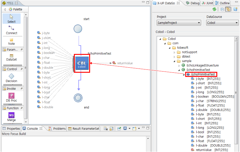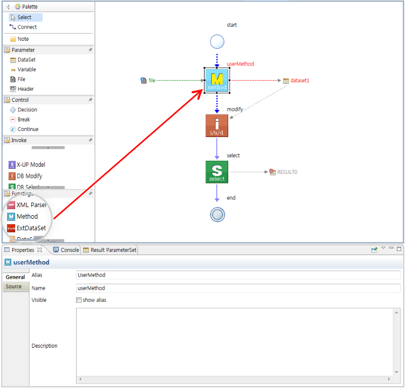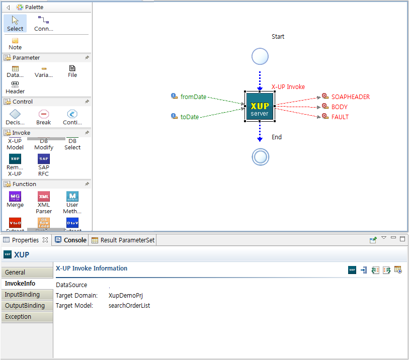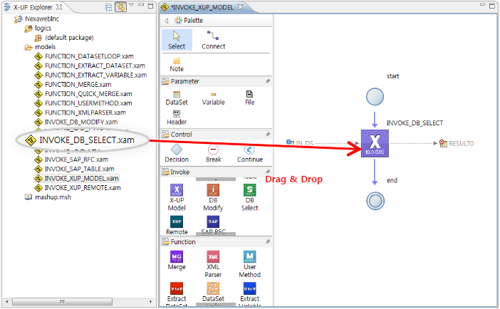 오토메이션 모델은 GUI 에디터를 이용하여 하나의 서비스에 해당하는 로직을 다이어그램으로 표현합니다. 표현된 각각의 다이어그램은 Invoke라고 하며 임의의 데이터소스로부터 데이터를 획득합니다. 데이터를 획득 하기 위한 데이터 정보는 X-UP 빌더의 에디터와 Properties View를 이용하여 작성하게 됩니다. 오토메이션 모델을 저장하면 Java 클래스 코드가 자동으로 생성이 되며 GUI 에디터에서 모델을 수정하게 되면 자동으로 클래스 코드에 반영 됩니다.