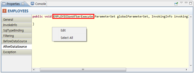 해당 Invoke가 사용하는 데이터소스를 통해 Legacy와 연결을 맺은 직후에 사용자가 원하는 로직을 자바 코드로 추가할 수 있습니다.
