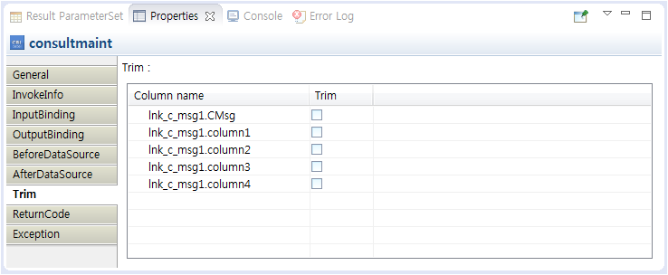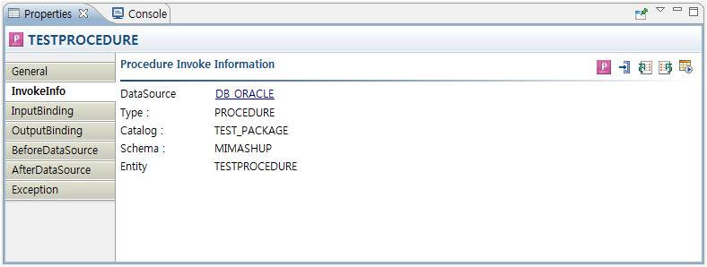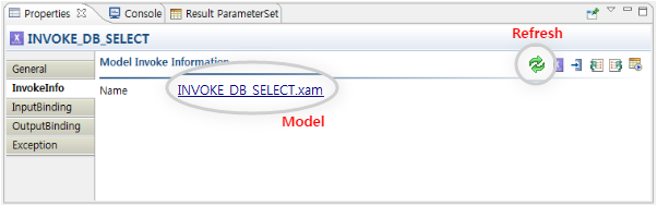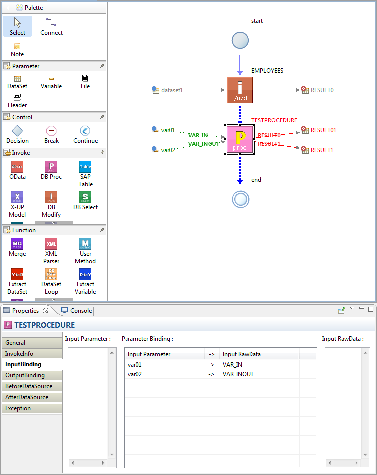 Input Binding/Output Binding은 Invoke가 실행 시 필요한 in-out 파라매터의 명칭과 모델에서 정의한 파라매터의 명칭을 바인딩해주는 역할을 수행합니다. Ex ) 프로시저가 입력 파라매터 명칭은 'VAR_IN'이지만 모델에서는 'var01' 명칭의 파라매터로 선언하여 사용할 수 있습니다. 프로시저가 호출 될 때 'var01' 파라매터는 'VAR_IN'으로 변환되어 프로시저를 호출하고 호출이 끝나는 시점에 원래의 'var01'으로 파라매터 명칭이 변경 됩니다.