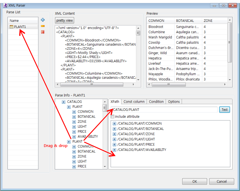 XML Content : 직접 입력 가능하며 파싱하고자 하는 XML 정보를 직접 입력합니다.