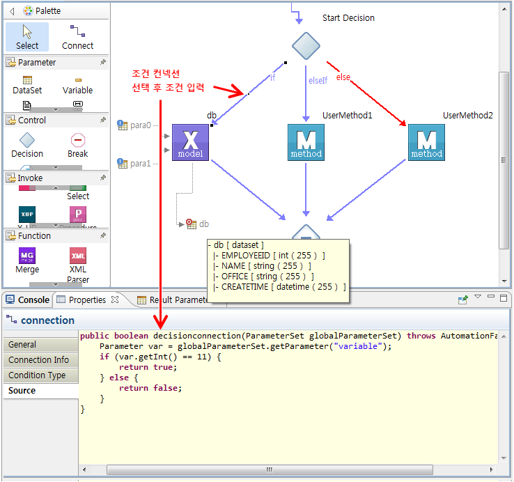 Decision | 에디터에서의 특정 조건에 따라 분기 처리를 할 수 있습니다.(if) |