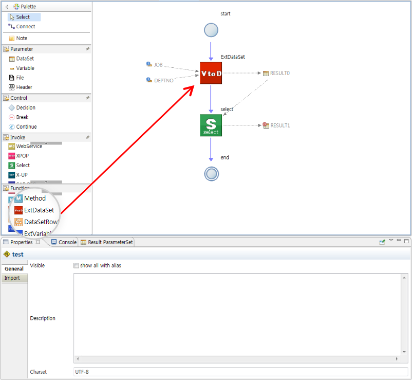 XML Parser Function은 XML 정보를 파싱하여 파라미터형식으로 생성하기 위한 컴포넌트입니다. 호출 시 Variable or Dataset 형식으로 가져옵니다.