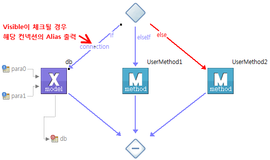 특히 Visible의 경우는 다른 컴포넌트의 visible과 다르게 Name / Alias의 정보가 없기 때문에 커넥션 중앙에 Alias를 보여줄지를 결정합니다.