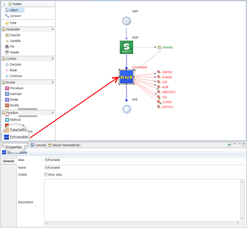 Extract Variable | DataSet의 컬럼을 분리하여 하나의 variable로 추출할 수 있습니다. |