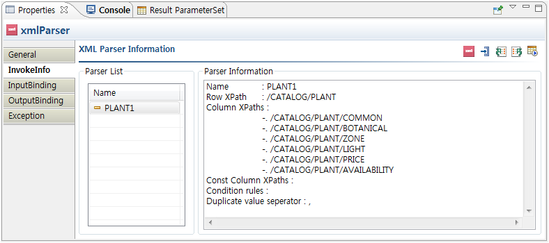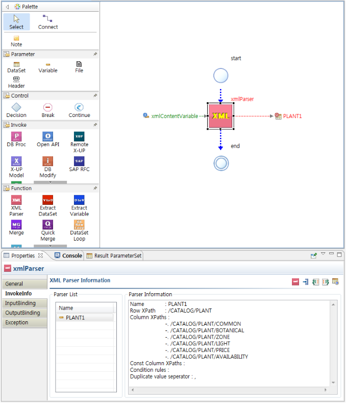 XML Parser Function은 Invoke를 생성하기 위한 XML Parser Function Dialog 와 다음과 같은 프로퍼티 속성탭을 가지고 있습니다.