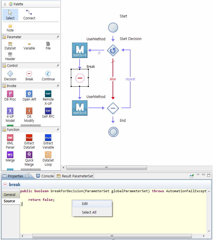 Break나 Continue노드를 선택하면 Properties Condition Code에 소스코드가 나옵니다. 소스코드에 마우스 오른쪽 버튼을 누르고 Edit를 클릭하면 Conditon Code를 사용자가 직접 정의할 수 있습니다.