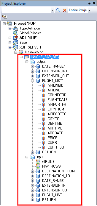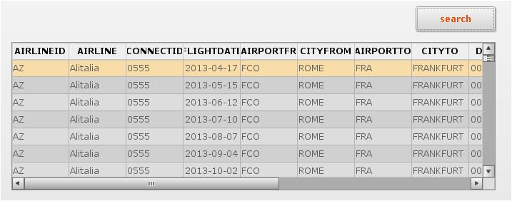 function btnSearch_onclick(obj:Button, e:ClickEventInfo) { var svcparam = "domain=" + "NexawebInc" // Domain name + "&model=" + "INVOKE_SAP_RFC" // Model name + "&format=" + "xml" + "&version=" + "xplatform"; var svcUrl = "XUP_SERVER::FrontControllerServlet.do"+ "?service=xupservice&" + svcparam; // Model Input parameters var strInDatasets = ""; var strOutDatasets = "FLIGHT_LIST1=FLIGHT_LIST1"; var strArgument = ""; transaction("searchFlightList", svcUrl, strInDatasets, strOutDatasets , strArgument, "fn_Transaction_Callback"); } function fn_Transaction_Callback(strSvcID, nErrorCode, strErrorMag) { if(nErrorCode < 0) { alert(strErrorMag); return } if(strSvcID == "searchFlightList") { trace(FLIGHT_LIST1.saveXML()); } }