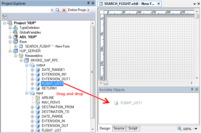 Project Explorer의 모델의 인터페이스 정보에서 출력 데이터셋을 Invisible Objects 에디터로 드래그&드롭 합니다.