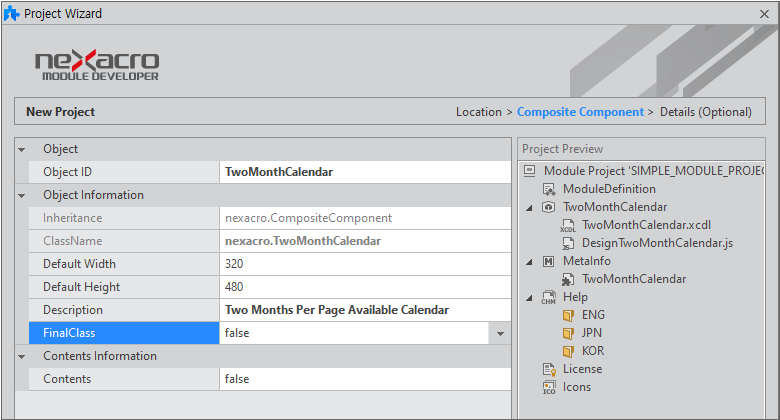 오브젝트 ID는 모듈 배포 시 컴포넌트 이름으로 사용하기 때문에 만들고자 하는 컴포넌트의 특징을 담고 있는 것이 좋습니다. 예제에서는 2개의 Calendar 컴포넌트를 나란히 배치한 컴포넌트를 만듭니다.