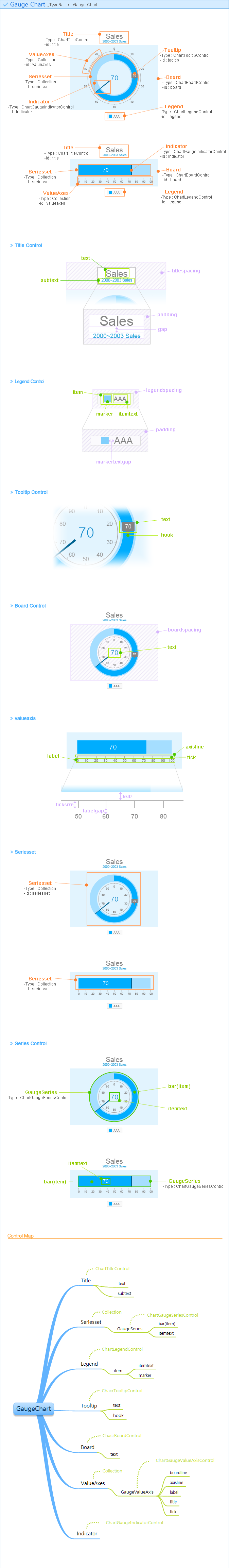 • GaugeChart에는 ChartGaugeValueAxisControl과 ChartGaugeValueSeriesControl을 한개씩만 설정할 수 있습니다. • GaugeChart는 Category 축 없이 Value 축만으로 구성됩니다. • GaugeChart는 VerticalBar, HorizontalBar, Circle 형태의 차트를 제공합니다. |