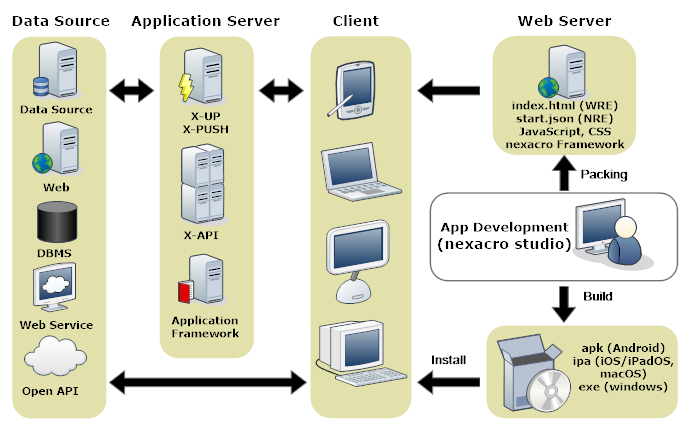 넥사크로플랫폼 앱은 사용자가 사용하는 클라이언트에서 동작합니다. 하지만 데이터 처리와 같은 작업을 위해 WAS(Web Application Server)를 필요로 할 수 있습니다. 넥사크로플랫폼은 데이터 처리를 위한 X-API 모듈을 함께 제공하고 있습니다. 또한, 필요에 따라 데이터를 실시간으로 처리해야 한다면 X-PUSH와 같은 추가적인 기술을 사용할 수 있습니다.