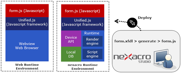 실행환경(Runtime Environment): 모바일 앱, 데스크톱 앱에서는 오픈소스 기반으로 자체 개발한 렌더 엔진과 스크립트 엔진으로 구성된 넥사크로 실행환경(NRE, nexacro runtime environment)을 사용합니다. 최적화된 실행환경을 제공해 대용량 데이터를 다루거나 복잡한 화면 구성 시 웹브라우저보다 빠르게 처리합니다. 또한, 운영체제에서 지원하는 다양한 API와 장비를 연동할 수 있습니다.