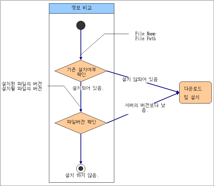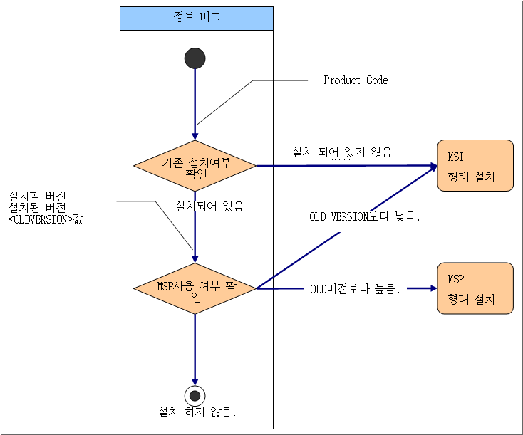 설치를 하는 경우 "정보 비교"동작에서 OLD VERSION을 활용해 MSP와 MSI중에 선택을 하게 됩니다. 이 동작에서 MiUpdater는 설치된 실제 버전과 비교를 하게 되며, 사용자 장치에 저장된 버전 정보의 <VERSION>태그의 값을 비교하지 않습니다.