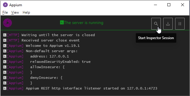 [Start Server] 버튼을 클릭해 Appium 서버를 시작합니다.