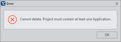 프로젝트 생성 시 자동으로 생성되며 필요에 따라 추가로 생성할 수 있습니다. 프로젝트는 하나 이상의 App Info를 포함해야 합니다. App Info가 하나인 경우 이를 삭제하려 하면 아래와 같은 경고 메시지를 보여주고 삭제하지 않습니다.