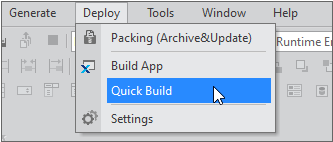 프로젝트의 Build 이력이 있는 경우에는 Quick Build 기능을 사용할 수 있습니다. Build 이력이 있는 경우에는 메뉴 [Deploy > Quick Build] 항목이 활성화됩니다.