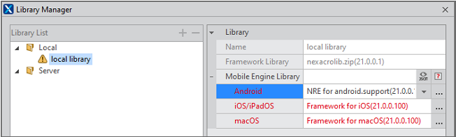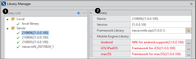 2 | 라이브러리 속성 | Name, Version, Framework Library는 필수항목입니다. Mobile Engine Library는 3개 항목 중 하나 이상은 지정해주어야 합니다. |