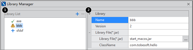 1 | 사용자 라이브러리 목록 | 앱빌더 서버에 등록된 사용자 라이브러리와 신규로 등록하려는 사용자 라이브러리 목록을 표시합니다. |